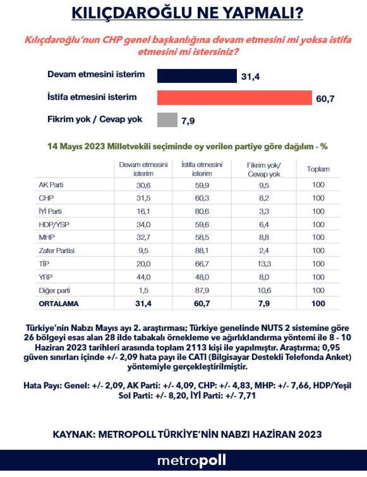Ankete katılan yurttaşların yüzde 60,7’si Kılıçdaroğlu’nun istifa etmesini istedi.