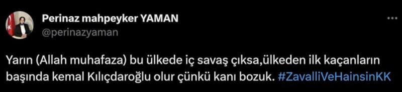 Yaman'ın geçtiğimiz yıllarda Kılıçdaroğlu'nu hedef alan bir paylaşımında, 'zavallı, hain ve kanı bozuk' ifadelerini kullandığı görüldü.