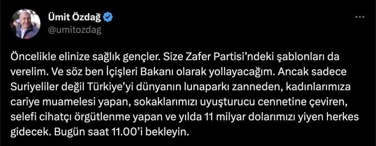 Özdağ, CHP Gençlik Kolları'nın göçmenlerle ilgili paylaşımını alıntılayarak, "Öncelikle elinize sağlık gençler. Size Zafer Partisi’ndeki şablonları da verelim. Ve söz ben İçişleri Bakanı olarak yollayacağım. Ancak sadece Suriyeliler değil Türkiye’yi dünyanın lunaparkı zanneden, kadınlarımıza cariye muamelesi yapan, sokaklarımızı uyuşturucu cennetine çeviren, selefi cihatçı örgütlenme yapan ve yılda 11 milyar dolarımızı yiyen herkes gidecek. Bugün saat 11.00’i bekleyin." dedi.