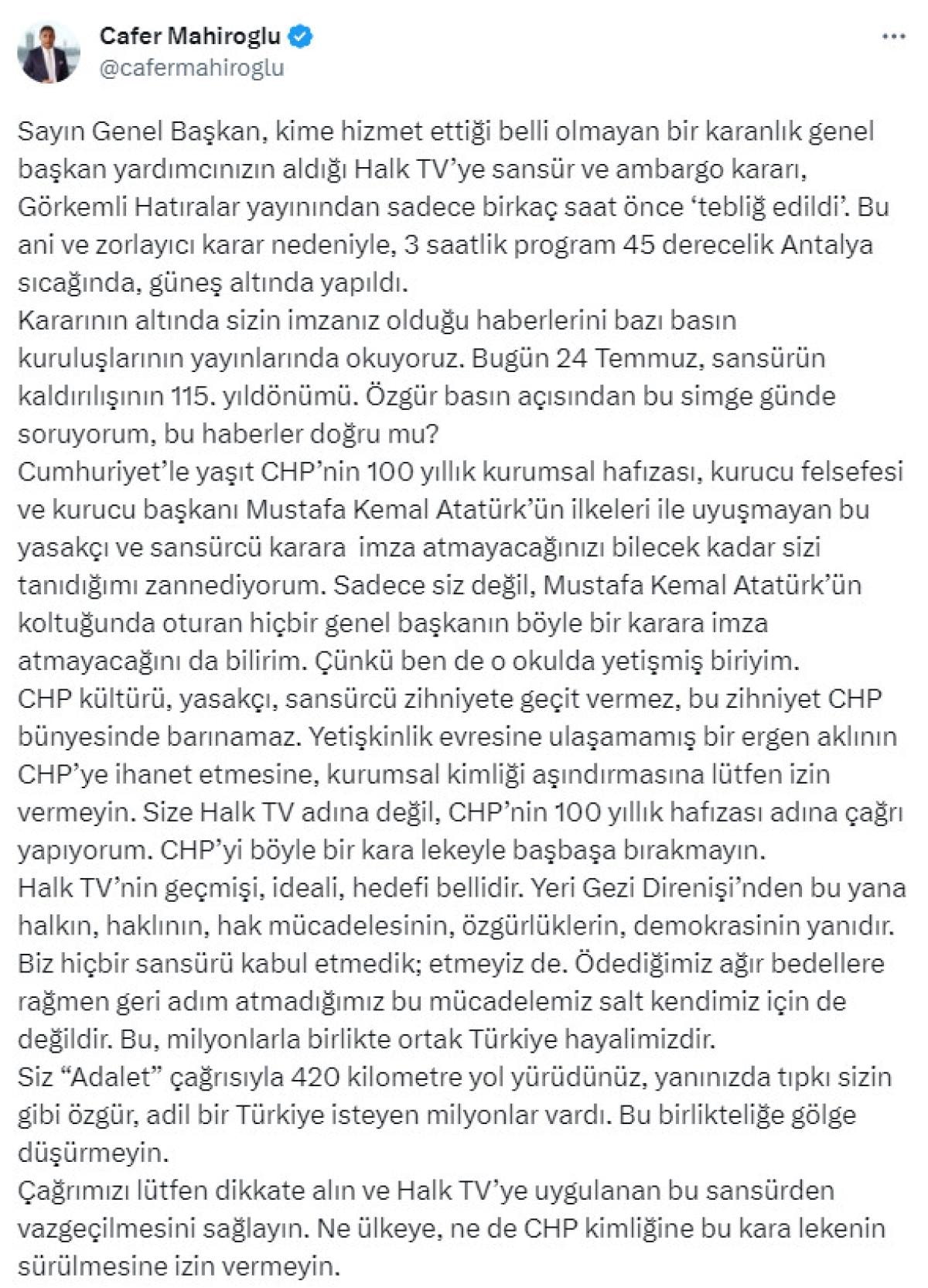 Sayın Genel Başkan, kime hizmet ettiği belli olmayan bir karanlık genel başkan yardımcınızın aldığı Halk TV’ye sansür ve ambargo kararı, Görkemli Hatıralar yayınından sadece birkaç saat önce ‘tebliğ edildi’. Bu ani ve zorlayıcı karar nedeniyle, 3 saatlik program 45 derecelik Antalya sıcağında, güneş altında yapıldı.