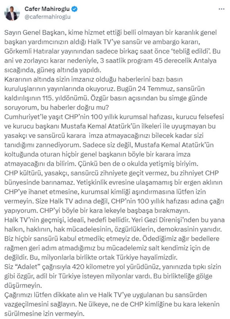 Cumhuriyet Halk Partisi'nin Halk TV ile sözleşmesini tek taraflı feshetmesinin ardından kanalın Yönetim Kurulu Başkanı Cafer Mahiroğlu sosyal medya hesabından açıklama yaptı. Mahiroğlu, "CHP’yi böyle bir kara lekeyle baş başa bırakmayın" diyerek sitem etti.