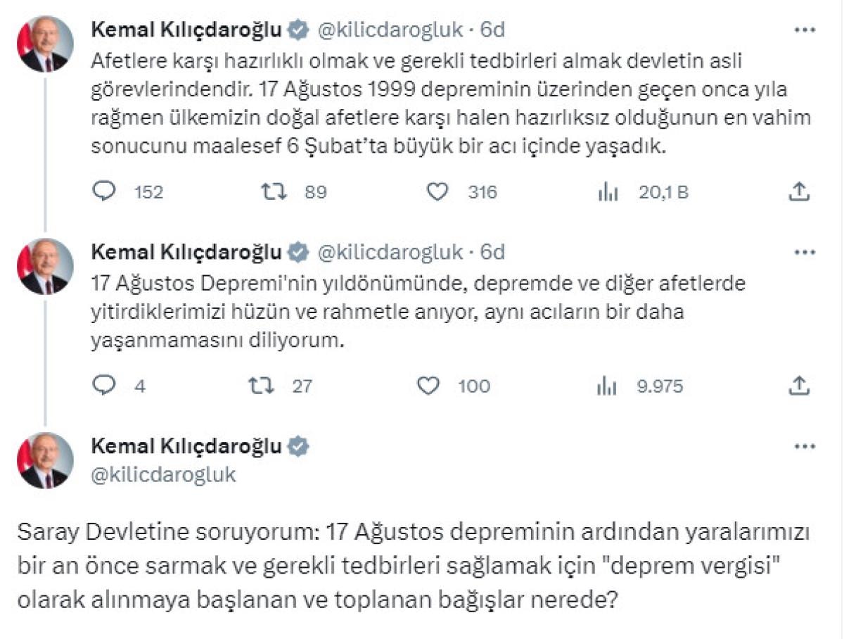 Saray devletine soruyorum: 17 Ağustos depreminin ardından yaralarımızı bir an önce sarmak ve gerekli tedbirleri sağlamak için "deprem vergisi" olarak alınmaya başlanan ve toplanan bağışlar nerede?
