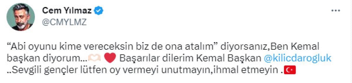 Cem Yılmaz, Teoman, Demet Akbağ, Fazıl Say, Gülşen, Tarkan, Hayko Cepkin ve birçok ünlü isim, CHP Lideri'nin mitinglerinde sembol haline gelen kalp emojisiyle ilk turda bitirelim desteği verdi.