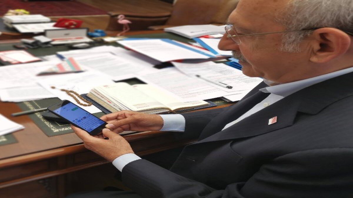 Masasında bir tesbih bulunan Kılıçdaroğlu'nun kullandığı telefonun da iPhone'un eski tuşlu modellerden olduğu gözlendi.
