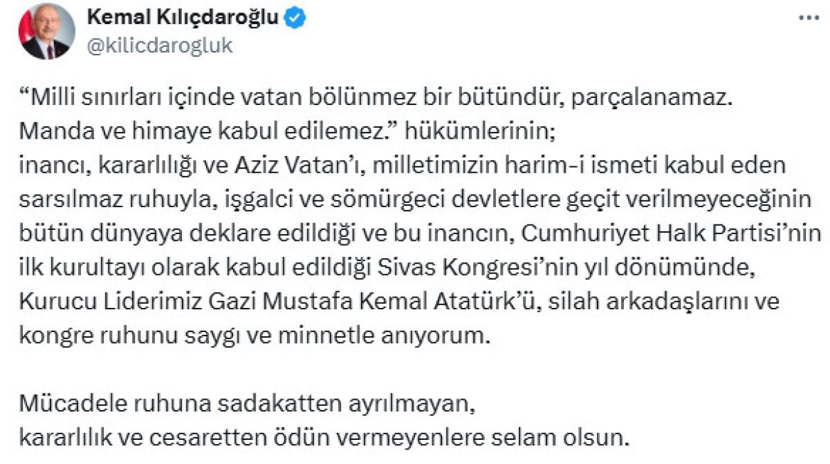 - Kemal Kılıçdaroğlu, Sivas Kongresi'nin yıl dönümünde "Mücadele ruhuna sadakatten ayrılmayan, kararlılık ve cesaretten ödün vermeyenlere selam olsun" mesajını paylaştı.