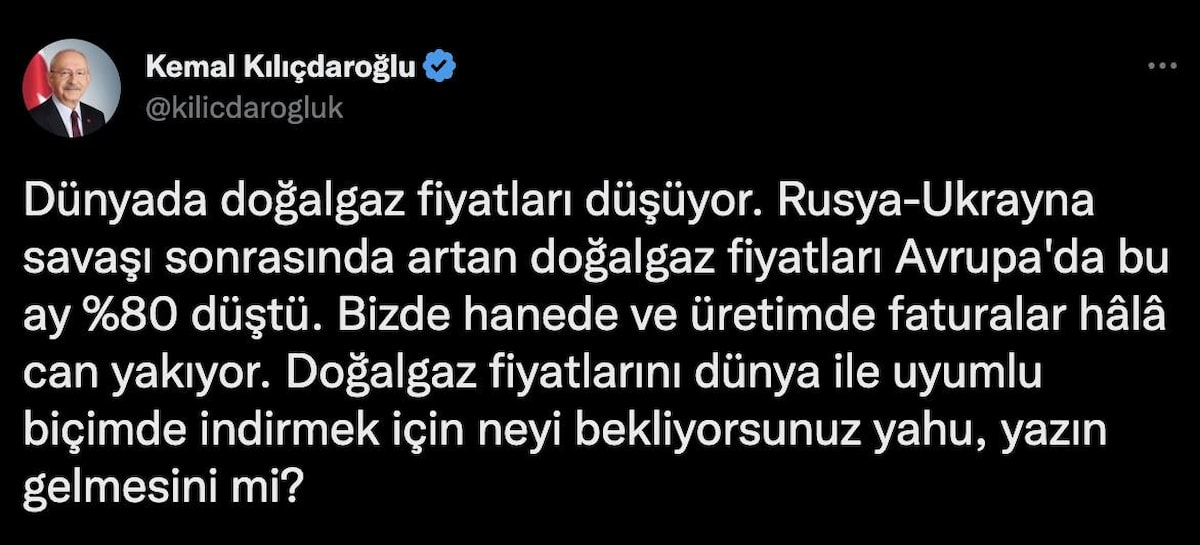 Twitter hesabından paylaşım yapan Kılıçdaroğlu, "Dünyada doğalgaz fiyatları düşüyor. Rusya-Ukrayna savaşı sonrasında artan doğalgaz fiyatları Avrupa'da bu ay yüzde 80 düştü. Bizde hanede ve üretimde faturalar hâlâ can yakıyor. Doğalgaz fiyatlarını dünya ile uyumlu biçimde indirmek için neyi bekliyorsunuz yahu, yazın gelmesini mi?" ifadelerine yer verdi.