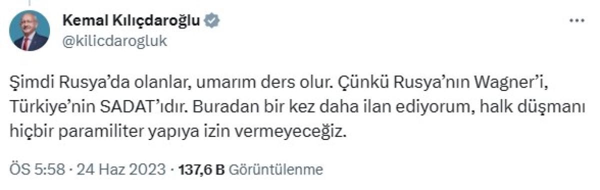 Rusya'da yaşanılanların Türkiye için bir ders olması gerektiğini savunan Kılıçdaroğlu, Rusya'nın Wagner'inin Türkiye'nin SADAT'ı olduğunu söyledi.