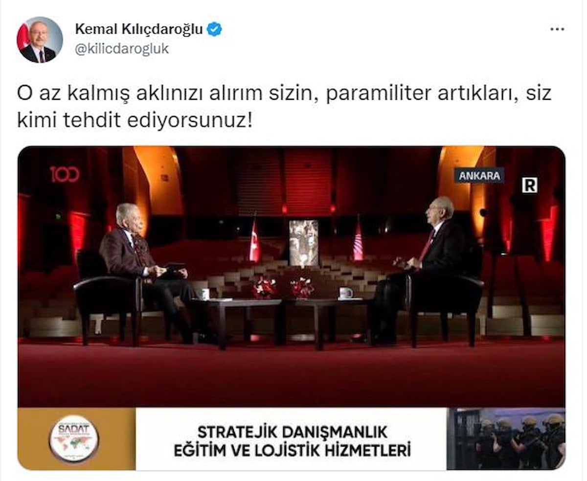 Yaşananların ardından Kemal Kılıçdaroğlu konuya ilişkin bir paylaşım yaptı ve SADAT'a göndermede bulunarak, "O az kalmış aklınızı alırım sizin, paramiliter artıkları, siz kimi tehdit ediyorsunuz!" dedi.
