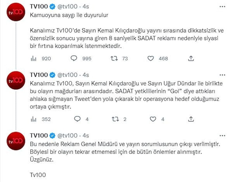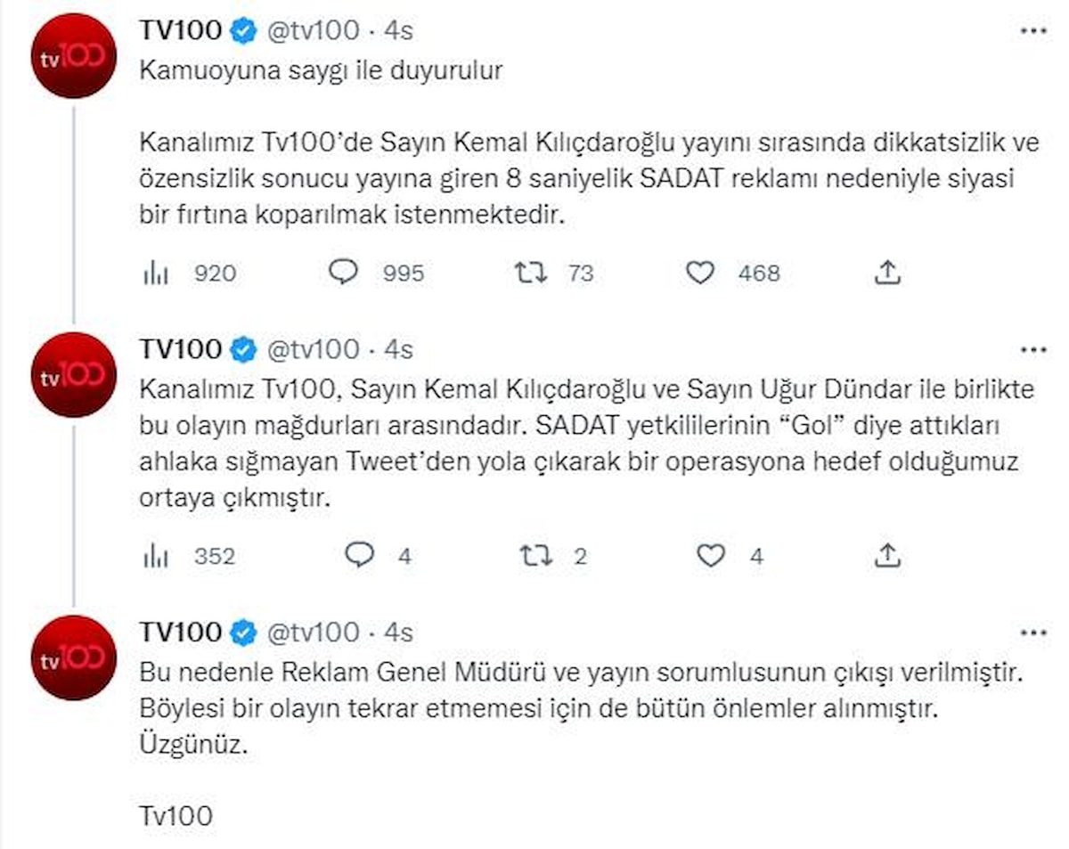 TV100'den yapılan açıklamada, "Kanalımız Tv100’de Sayın Kemal Kılıçdaroğlu yayını sırasında dikkatsizlik ve özensizlik sonucu yayına giren 8 saniyelik SADAT reklamı nedeniyle siyasi bir fırtına koparılmak istenmektedir.Kanalımız Tv100, Sayın Kemal Kılıçdaroğlu ve Sayın Uğur Dündar ile birlikte bu olayın mağdurları arasındadır. SADAT yetkililerinin “Gol” diye attıkları ahlaka sığmayan Tweet’den yola çıkarak bir operasyona hedef olduğumuz ortaya çıkmıştır." dendi.