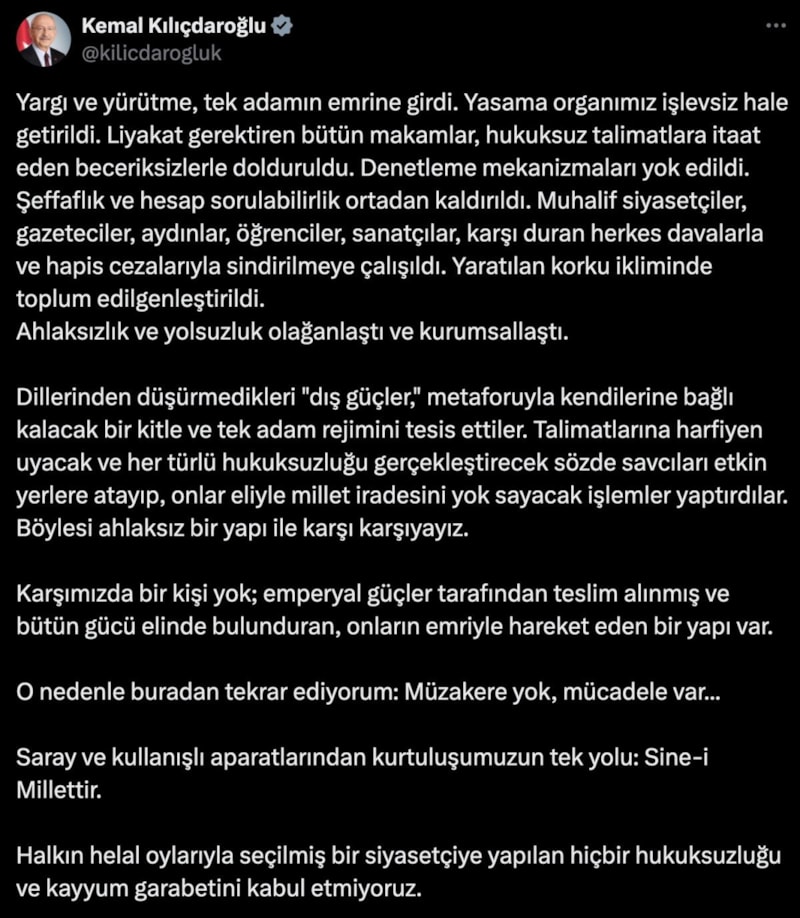 Esenyurt Belediyesi'ne kayyum atanmasına karşı sessizliğini bozan CHP'nin eski lideri Kemal Kılıçdaroğlu, tek kurtuluş yolunun sine-i millet olduğunu söyledi.