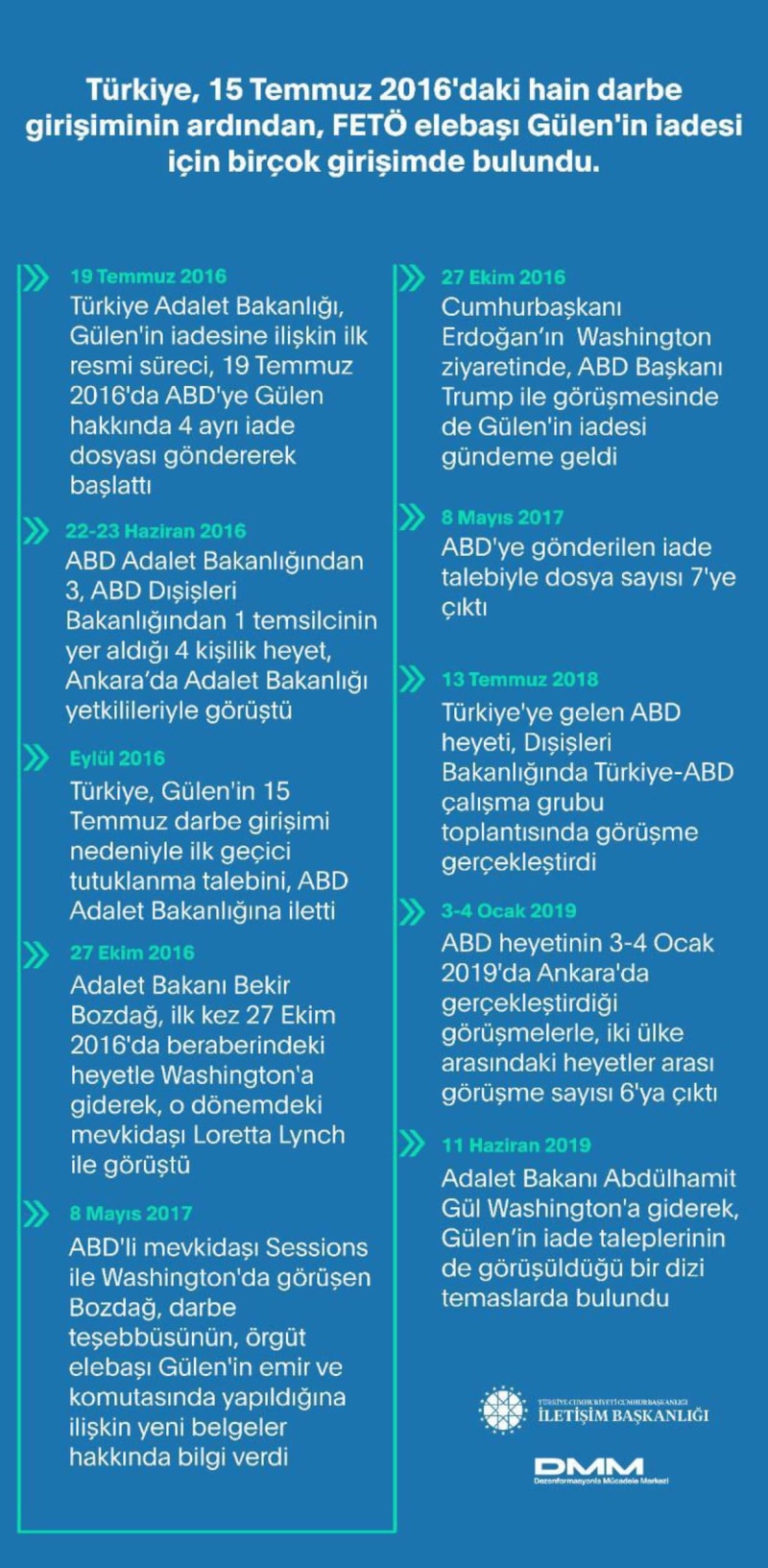 AK Partili Dağ, iade taleplerini gösteren bir çizelge paylaştı. Buna göre 19 Temmuz 2016'da, Adalet Bakanlığı, Gülen'in iadesine ilişkin ilk resmi süreci, ABD'ye 4 ayrı iade dosyası göndererek başlattı.