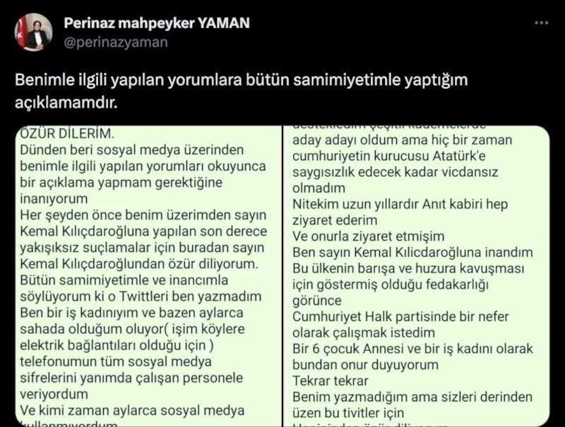 Özür dilerim. Dünden beri sosyal medya üzerinden benimle ilgili yapılan yorumları okuyunca bir açıklama yapmam gerektiğine inanıyorum. Her şeyden önce benim üzerimden Sayın Kemal Kılıçdaroğlu'na yapılan son derece yakışıksız suçlamalar için buradan Sayın Kemal Kılıçdaroğlu'ndan özür diliyorum. Bütün samimiyetimle ve inancımla söylüyorum ki o tweetleri ben yazmadım. Ben bir iş kadınıyım ve bazen aylarca sahada olduğum oluyor (işim köyleri elektrik bağlantıları olduğu için) telefonumun tüm sosyal medya şifrelerini yanımda çalışan personele veriyordum ve kimi zaman aylarca sosyal medya kullanmıyordum. Evet doğrudur yıllarca AK Parti'yi destekledim çeşitli kademelerde aday adayı oldum ama hiçbir zaman Cumhuriyetin kurucusu Atatürk'e saygısızlık edecek kadar vicdansız olmadım. Nitekim uzun yıllardır Anıtkabir'e hep ziyaret ederim ve onurla ziyaret etmişim. Ben Sayın Kemal Kılıçdaroğlu'na inandım. Bu ülkenin barış ve özgüre kavuşması için göstermiş olduğu fedakarlığı görünce Cumhuriyet Halk Partisi’nde bir nefer olarak çalışmak istedim. Bir altı çocuk annesi ve bir iş kadını olarak bundan onur duyuyorum. Tekrar tekrar benim yazmadığım ama sizleri derinden üzen bu tweetler için hepinize özür diliyorum Saygılarımla.