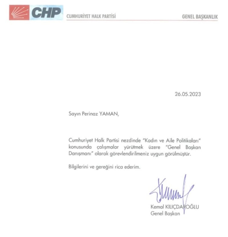 CHP liderinin ıslak imzası ile 'Kadın ve Aile Politikaları' konusunda çalışmalar yürütmek üzere Genel Başkan Danışmanı' olarak Perinaz Mahpeyker Yaman atandı.