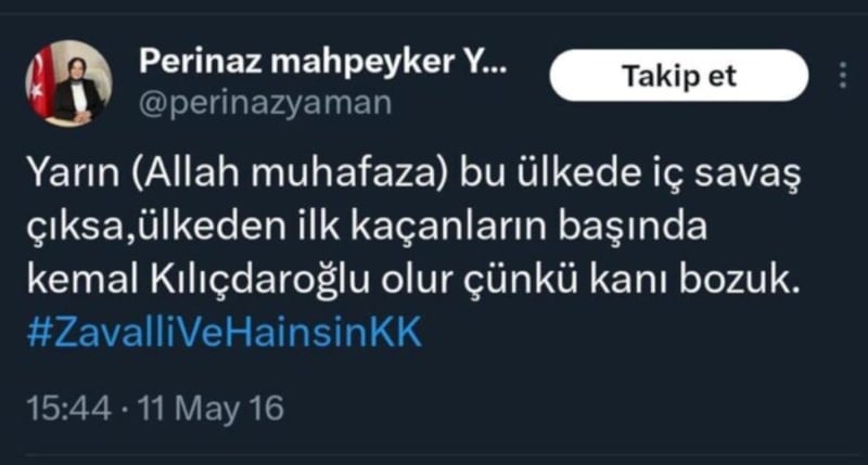 Yaman'ın geçtiğimiz yıllarda Kılıçdaroğlu'nu hedef alan bir paylaşımında, 'zavallı, hain ve kanı bozuk' ifadelerini kullandığı görüldü.