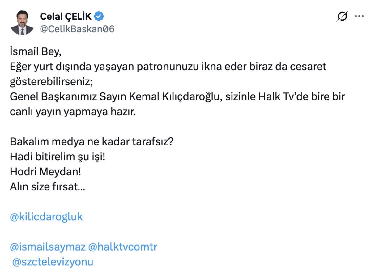 "İsmail Bey, eğer yurt dışında yaşayan patronunuzu ikna eder biraz da cesaret gösterebilirseniz; Genel Başkanımız Sayın Kemal Kılıçdaroğlu, sizinle Halk TV’de bire bir canlı yayın yapmaya hazır.