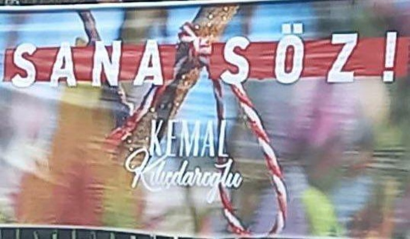 Pankartlarda ise bir detay dikkat çekti. Görselde, darağacına ve ipe benzeyen ayrıntı sosyal medyada gündem oldu.