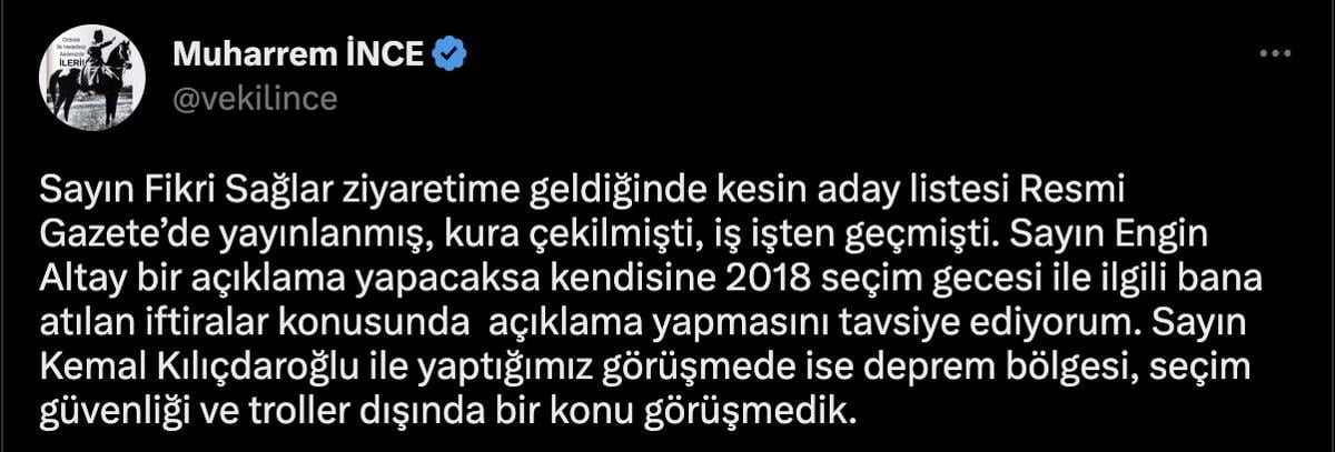 Muharrem İnce konuyla ilgili, "Sayın Fikri Sağlar ziyaretime geldiğinde kesin aday listesi Resmi Gazete’de yayınlanmış, kura çekilmişti, iş işten geçmişti. Sayın Engin Altay bir açıklama yapacaksa kendisine 2018 seçim gecesi ile ilgili bana atılan iftiralar konusunda açıklama yapmasını tavsiye ediyorum. Sayın Kemal Kılıçdaroğlu ile yaptığımız görüşmede ise deprem bölgesi, seçim güvenliği ve troller dışında bir konu görüşmedik" dedi.