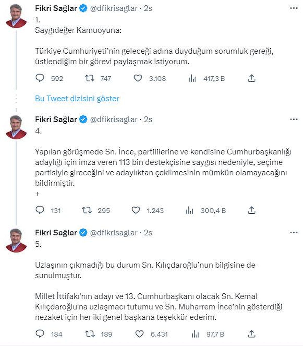 "Saygıdeğer Kamuoyuna: Türkiye Cumhuriyeti’nin geleceği adına duyduğum sorumluk gereği, üstlendiğim bir görevi paylaşmak istiyorum. Önümüzdeki seçimin ülkemizi çöküşe götüren baskıcı ve yasakçı tek adam rejiminden kurtulmak ve parlamenter demokrasiyi yeniden inşa etmek için hayati öneme sahip olduğu, değişim isteyen tüm yurttaşların ve toplumsal muhalefetin bilincindedir. Bu bilinç içinde ve tarihin yüklediği sorumluluk gereği, kırgınlık ve kızgınlıkların bir tarafa bırakılarak birleşmenin sağlanması için, Sn. Kılıçdaroğlu'nun bilgisi ve oluruyla 3 Nisan'da Sn. İnce ile Memleket Partisi genel merkezinde bir uzlaşma görüşmesi gerçekleştirdim. Yapılan görüşmede Sn. İnce, partililerine ve kendisine Cumhurbaşkanlığı adaylığı için imza veren 113 bin destekçisine saygısı nedeniyle, seçime partisiyle gireceğini ve adaylıktan çekilmesinin mümkün olamayacağını bildirmiştir. Uzlaşının çıkmadığı bu durum Sn. Kılıçdaroğlu’nun bilgisine de sunulmuştur. Millet İttifakı'nın adayı ve 13. Cumhurbaşkanı olacak Sn. Kemal Kılıçdaroğlu'na uzlaşmacı tutumu ve Sn. Muharrem İnce’nin gösterdiği nezaket için her iki genel başkana teşekkür ederim."