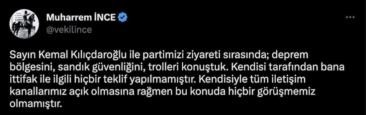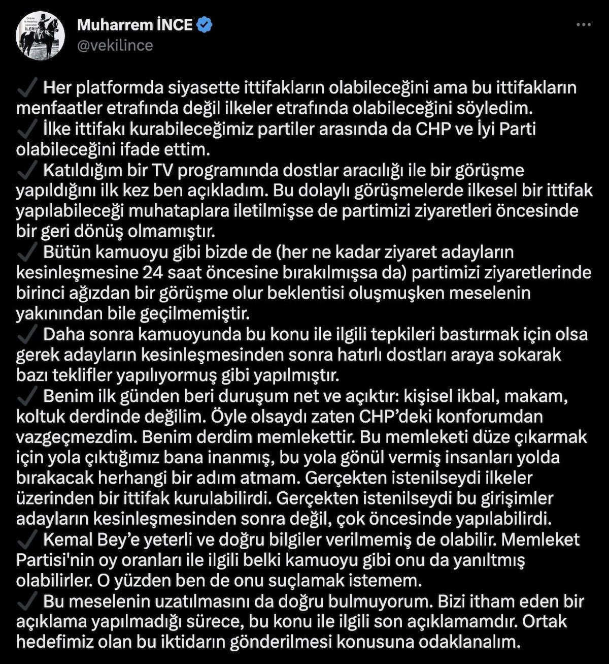 Kılıçdaroğlu'nun 'teklif yaptık' sözleri sonrası gelen açıklamaların yanı sıra İnce de uzun bir paylaşım yaptı.