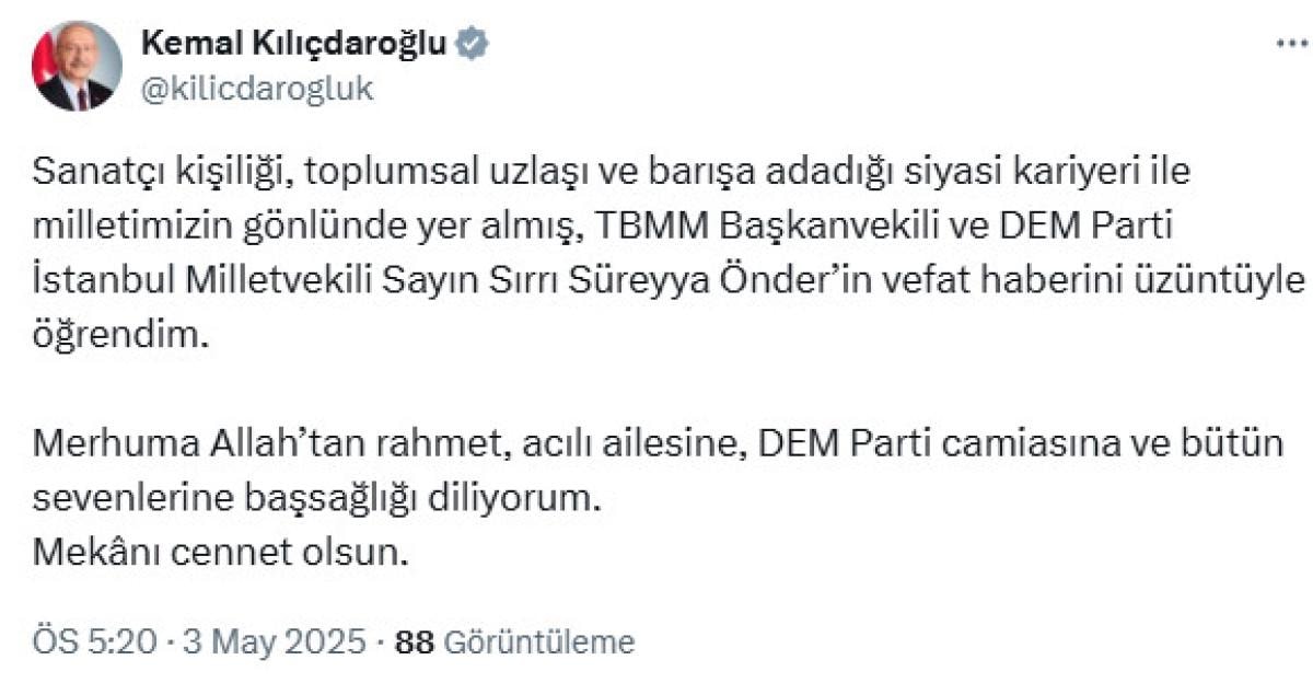 Önder 'in vefatını üzüntüyle öğrendiğini belirten Kılıçdaroğlu, şu ifadeleri kullandı: