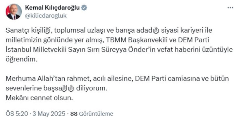 Sırrı Süreyya Önder'in vefatı sonrası mesaj yayınlayan CHP eski Genel Başkanı Kemal Kılıçdaroğlu, "Merhuma Allah’tan rahmet, acılı ailesine, DEM Parti camiasına ve bütün sevenlerine başsağlığı diliyorum" dedi.