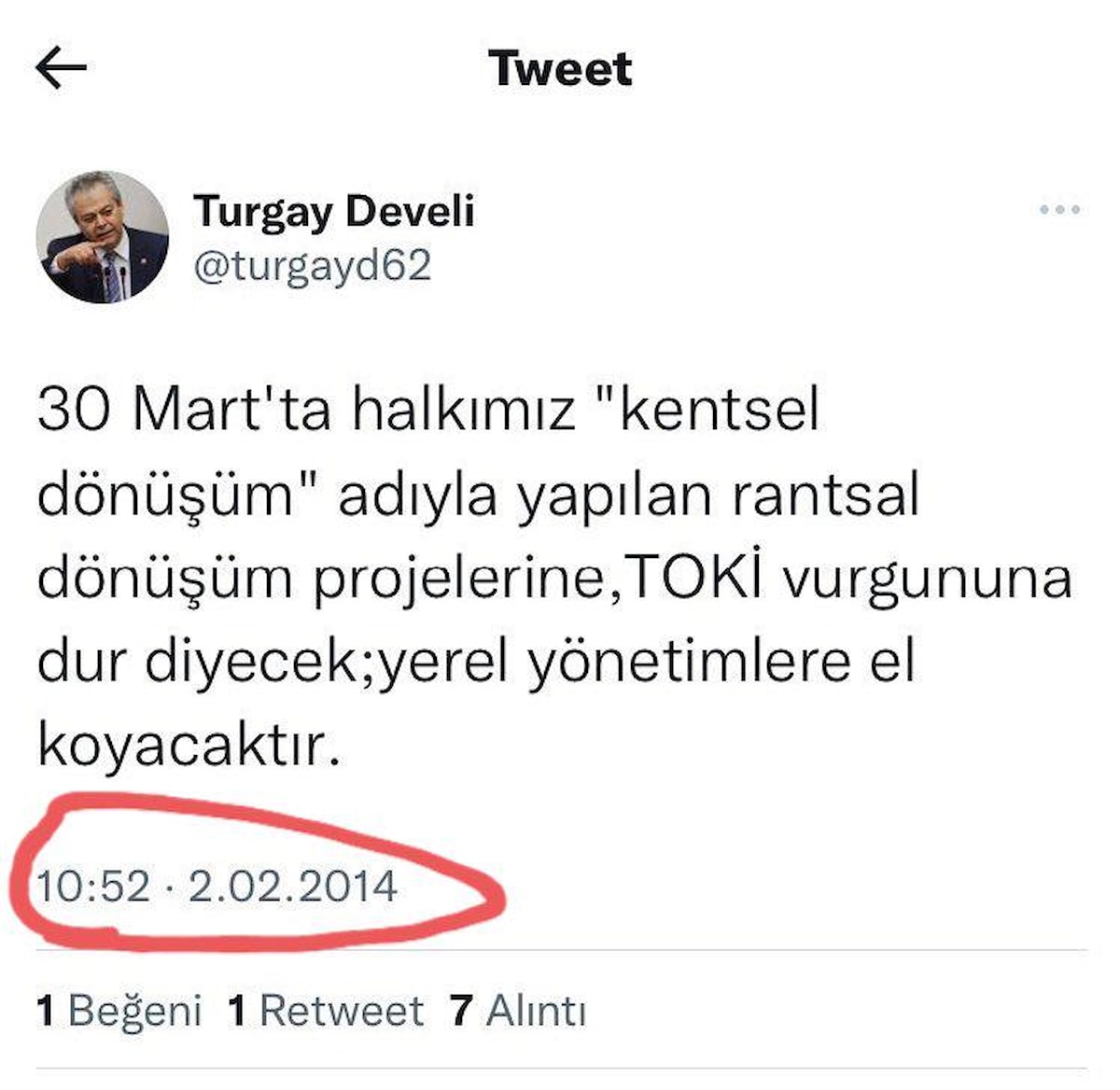 Develi, 2014 tarihinde yaptığı paylaşımla halkı kentsel dönüşüme karşı tavır alarak yerel seçimlerde oy kullanmaya çağırıyor.