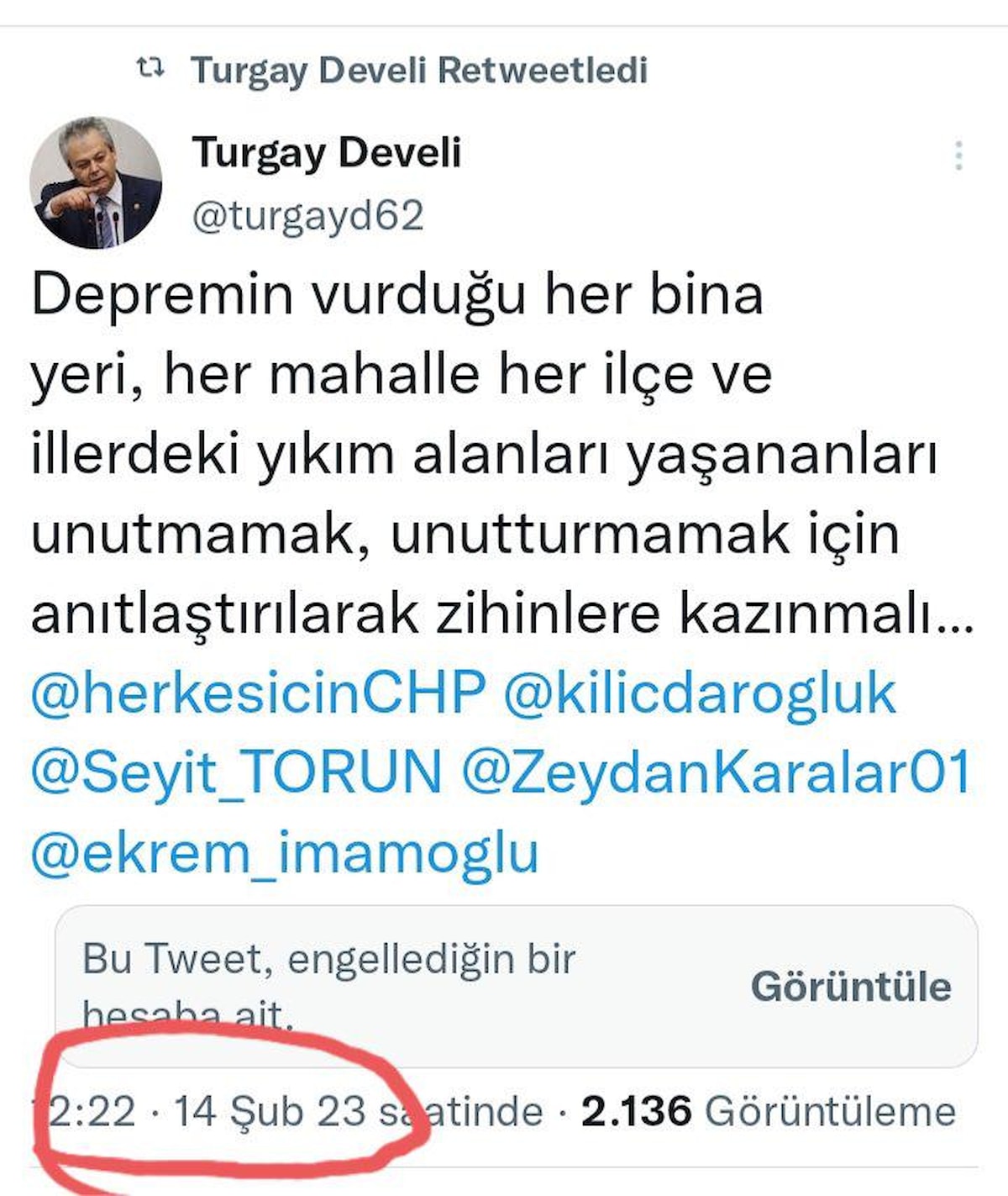 CHP'li belediye başkanlarını etiketleyerek yaptığı paylaşımda Develi, "Depremin vurduğu her bina yeri, her mahalle her ilçe ve illerdeki yıkım alanları yaşananları unutmamak, unutturmamak için anıtlaştırılarak zihinlere kazınmalı…" ifadelerine yer verdi.