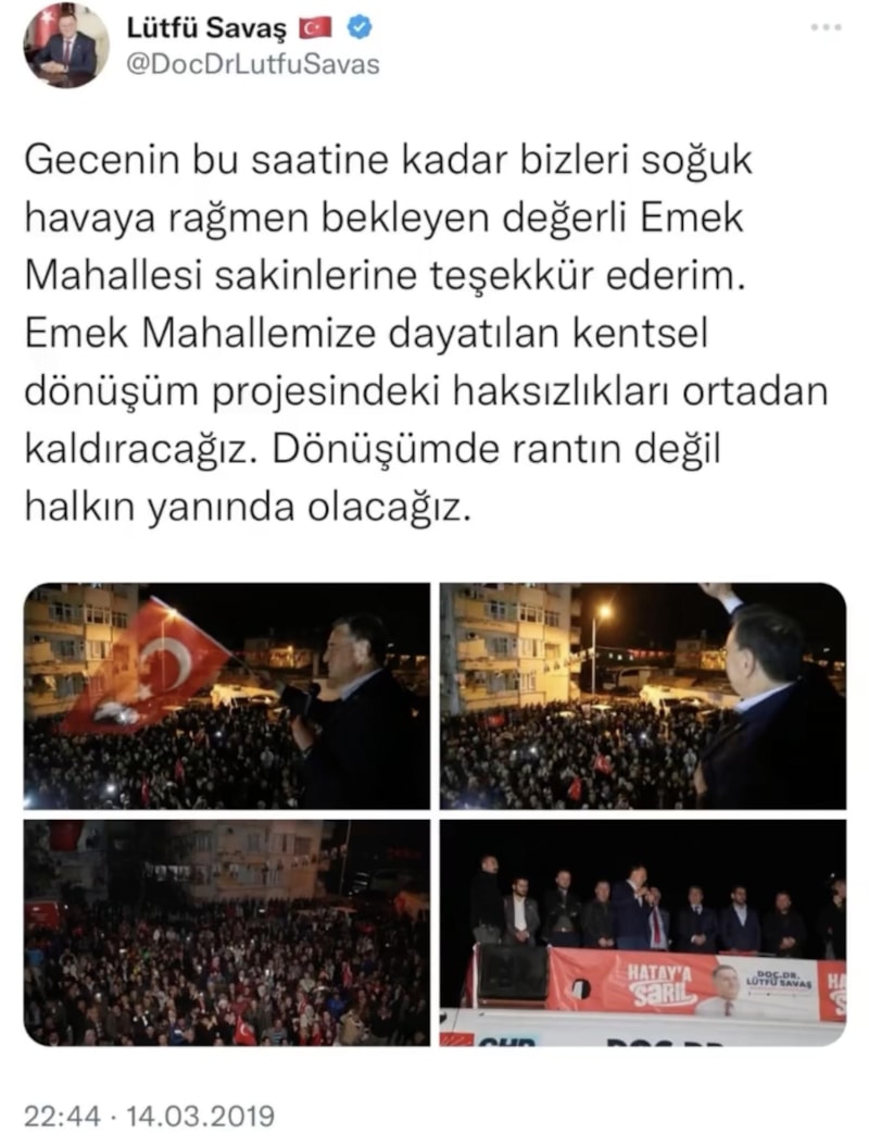 Lütfü Savaş 2019 yerel seçimlerindeki adaylık sürecinde Hatay’ın Antakya ilçesine bağlı Emek Mahallesi’nde kentsel dönüşüme karşı çıktı.