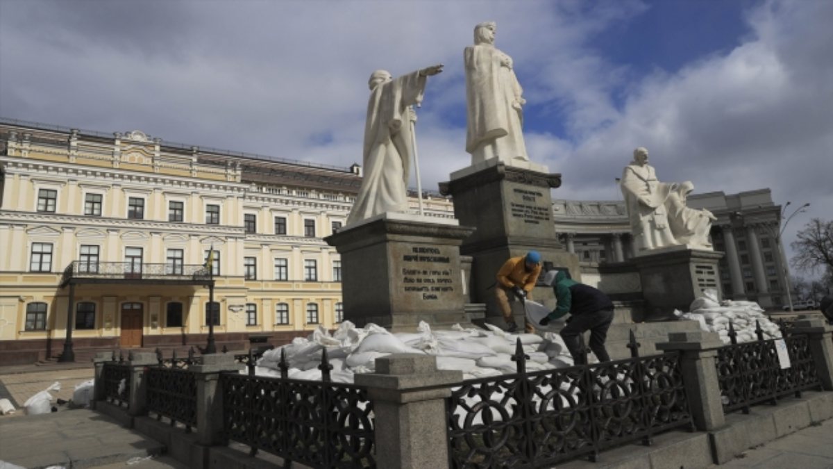 Ukrayna'nın diğer bölgelerinde görülen sanat eserlerini saldırılardan koruma çalışmaları Kiev'in merkez caddelerindeki meydanlarda da başladı.