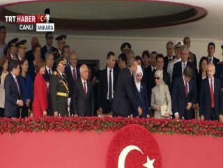 Resmi geçit töreninin ardından gözler protokol tribününde bulunan Cumhurbaşkanı Recep Tayyip Erdoğan ile CHP Genel Başkanı Kemal Kılıçdaroğlu'na çevrildi. Erdoğan'ın tokalaşmak için hamle yaptığı Kılıçdaroğlu, karşılık vermeyince cumhurbaşkanı da ani bir kararla yerine oturdu.