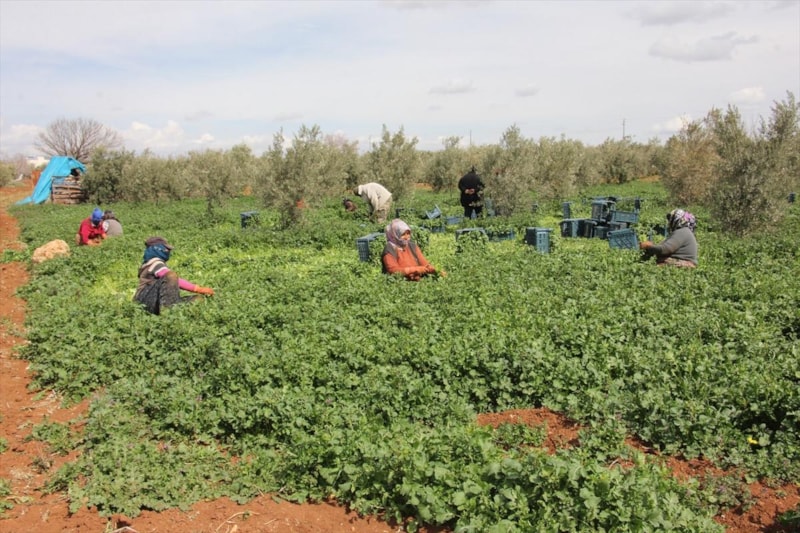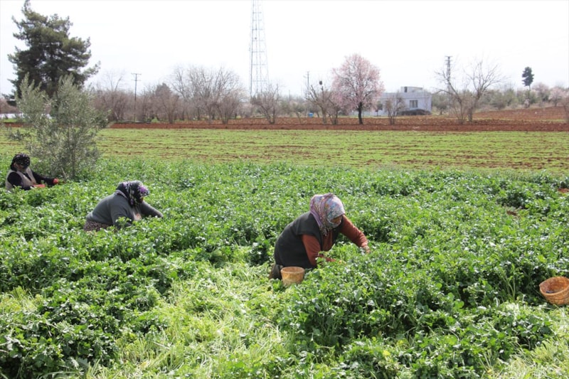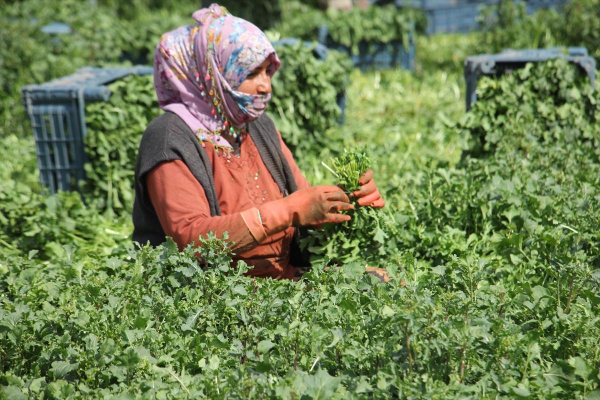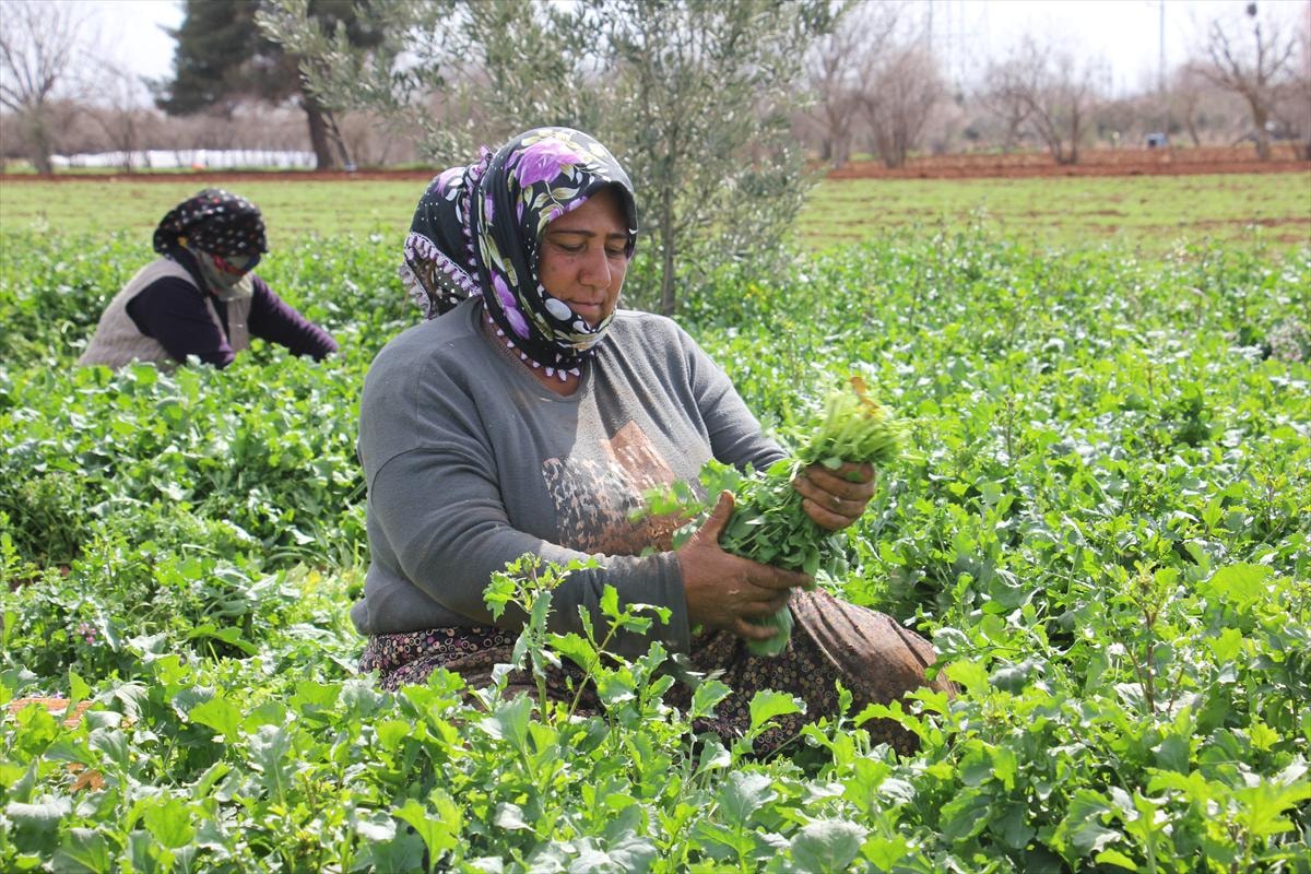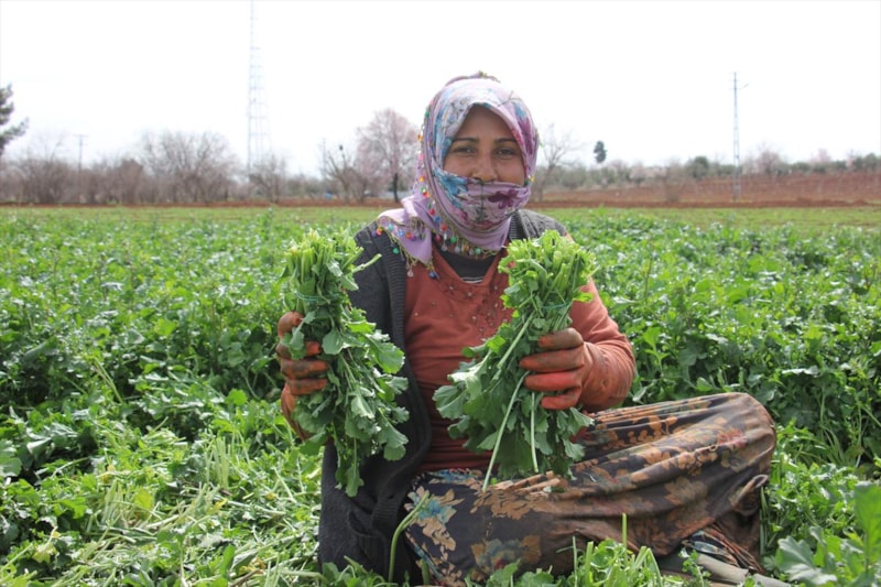 Aile bütçelerine katkıda bulunmak için çalışan kadınlar, tarlada roka ve tere hasadı yapıyor.