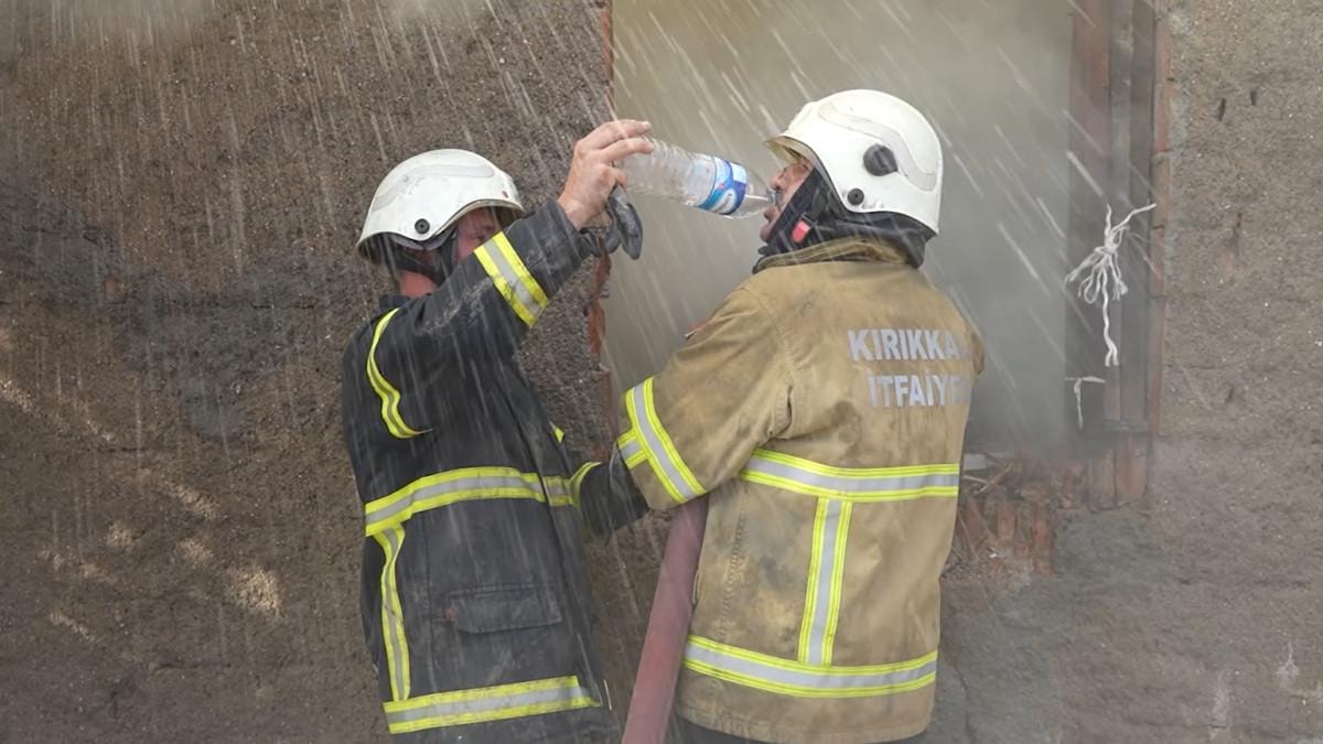 Görüntülerde yoğun sıcak altında çalışan bir itfaiye erine mesai arkadaşının su içirdiği görüldü.