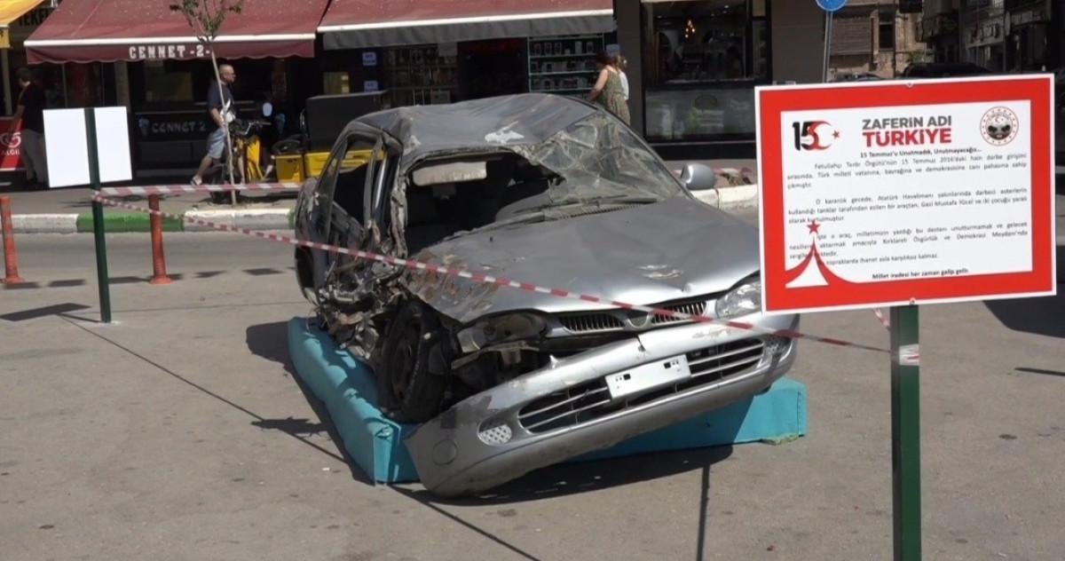 Kırklareli'de, 15 Temmuz gecesi Atatürk Havalimanı yakınlarında darbeci askerler tarafından tankla ezilen otomobil sergileniyor.