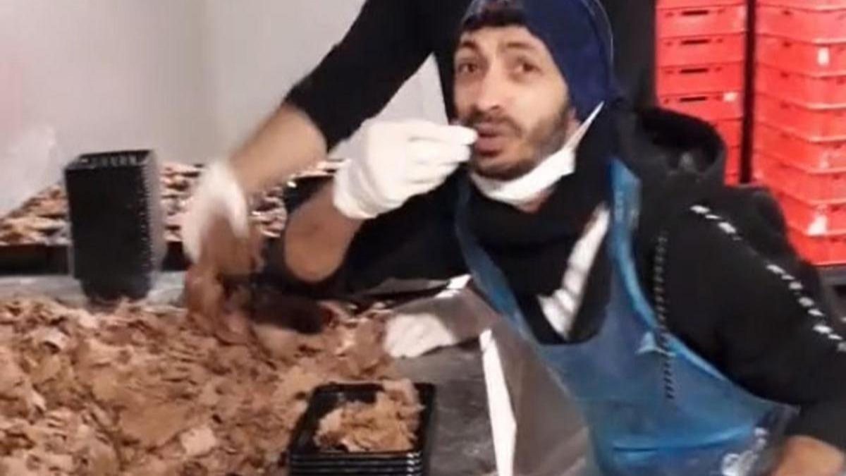 Kırklareli'nin Pınarhisar ilçesinde bir et entegre tesisinde 2 çalışan, maskesiz olarak, müzik eşliğinde hazır döner paketledikleri anları kameraya aldı.