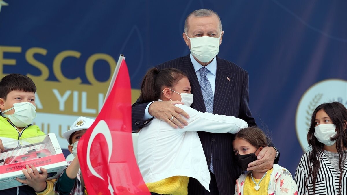 Sahneye çıkan çocuklardan bazıları, Erdoğan'ı görünce heyecanlanarak ağlamaya başladı. Çocuklara sarılarak teselli eden Cumhurbaşkanı Erdoğan, güzen anlara vesile oldu.