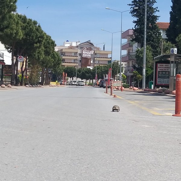 Sokağa çıkma kısıtlaması kapsamında insanlar evlerinde kalınca, boş sokaklar da hayvanlara kaldı. Antalya'nın Serik ilçesinde bir kaplumbağa, ağır adımlarla caddede tur attı.
