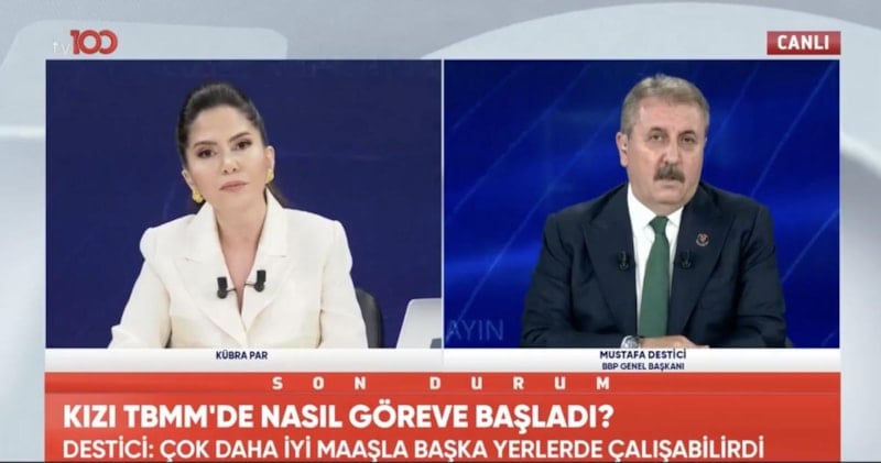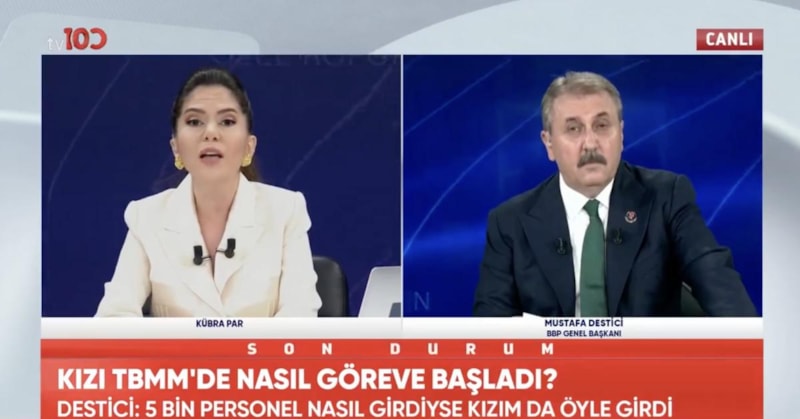 Canlı yayında gazeteci Kübra Par ile Mustafa Destici arasında, BBP liderinin kızının TBMM’de işe girmesiyle ilgili gerilim yaşandı. Par, "O zaman bu vatanın evlatları nasıl iş bulacak?" diye sordu. Destici ise Par'ın kasıtlı bir yayın yaptığını iddia etti.