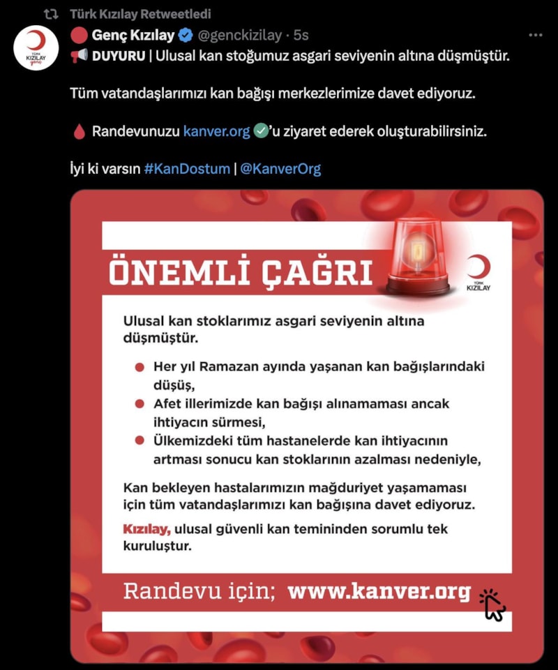 Ulusal kan stoklarımız asgari seviyenin altına düşmüştür. Her yıl ramazan ayında yaşanan kan bağışlarındaki düşüş, afet illerimizde kan bağışı alınamaması ancak ihtiyacın sürmesi, ülkemizdeki tüm hastanelerde kan ihtiyacının artması sonucu kan stoklarının azalması nedeniyle, kan bekleyen hastalarımızın mağduriyet yaşamaması için tüm vatandaşlarımızı kan bağışına davet ediyoruz. Kızılay, ulusal güvenli kan temininden sorumlu tek kuruluştur.