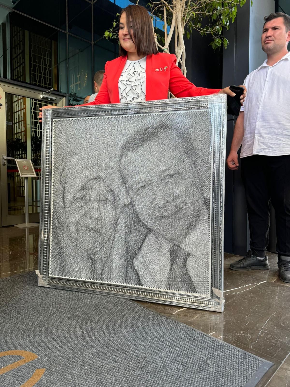 Çeşitli hediyeler sunulan Cumhurbaşkanı Erdoğan'ı duygulandıracak bir tablo da yer aldı.