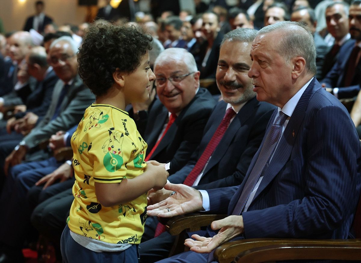 Minik çocuk, Cumhurbaşkanı Erdoğan'la yaşadığı anı, "Onu çok seviyoruz. 'Erdoğan dede sana sarılabilir miyim?' dedim, 'Tabii' dedi. Ben de yanacıklarından öptüm." sözleriyle anlattı.