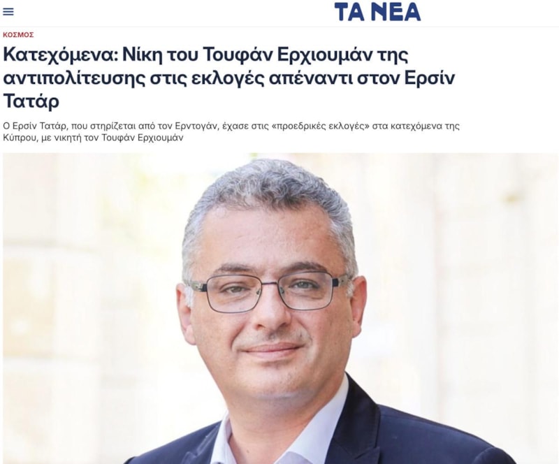 Ta Nea gazetesi ise manşetten verdiği haberde, "Yüksek Seçim Kurulu'nun verilerine göre, Türkiye Cumhurbaşkanı Tayyip Erdoğan'ın desteğini arkasına alan Kıbrıs Türk Lideri Ersin Tatar, işgal altındaki Kuzey Kıbrıs'ta yapılan 'cumhurbaşkanlığı seçimlerinde' yenilgiye uğradı." ifadelerine yer verdi.