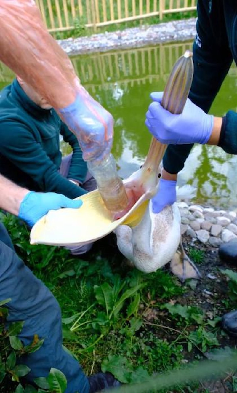 Hayvanat bahçesinde bulunan bir pelikan, bir ziyaretçinin atmış olduğu pet şişeyi yuttu.