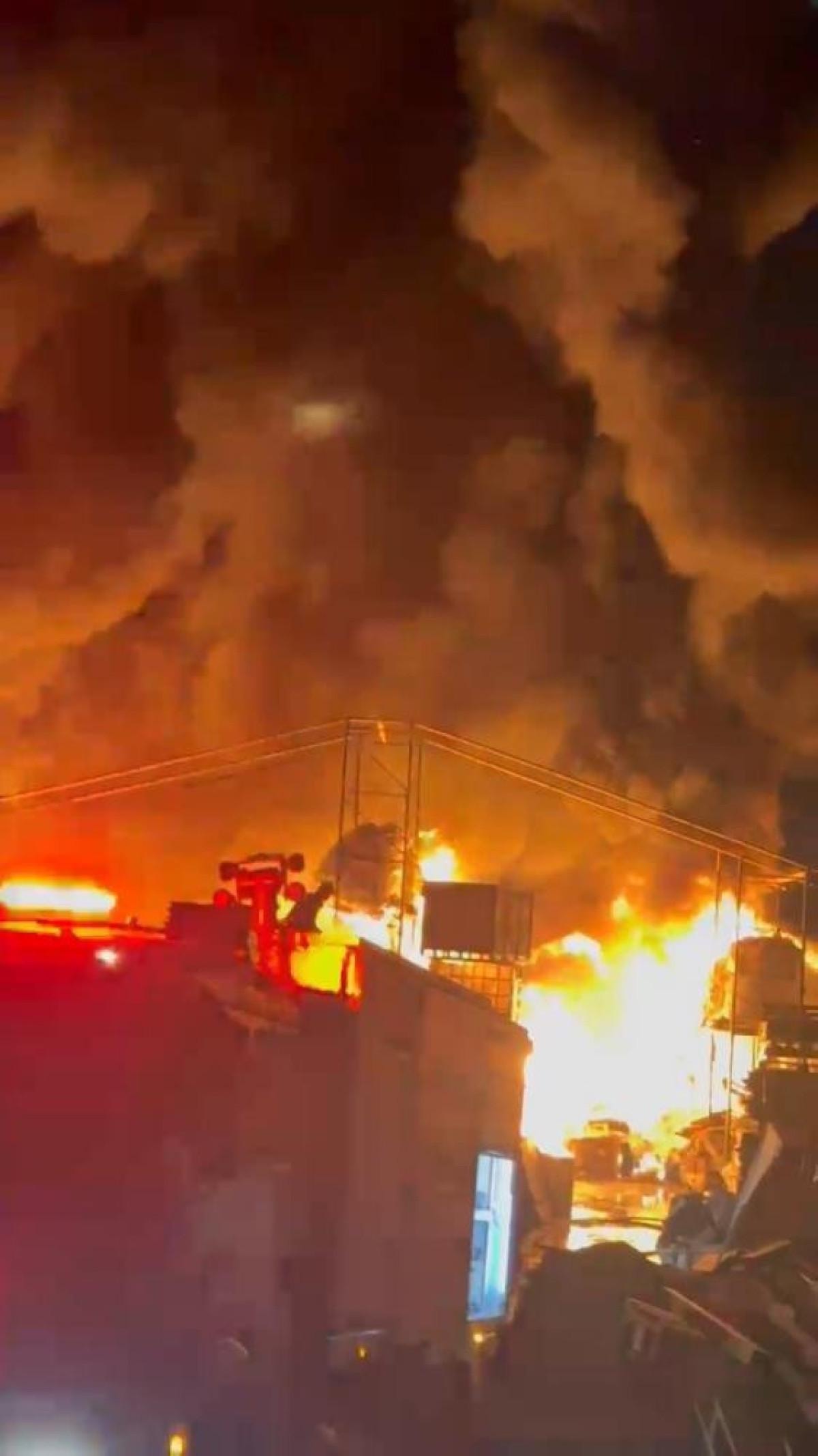 İtfaiye ekiplerinin depodaki soğutma çalışmaları sürüyor.