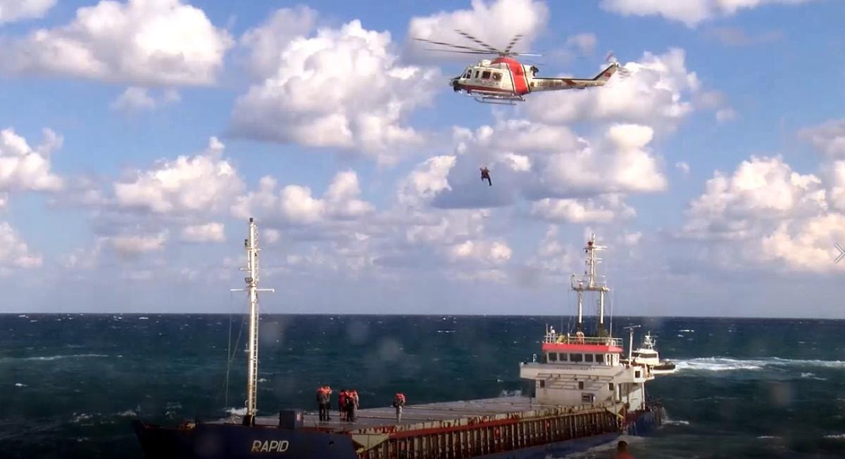 Kocaeli’nin Kandıra ilçesi kıyılarına sürüklenen Tanzanya bandıralı RAPID isimli kuru yük gemisinde mahsur kalan 7 mürettebat, bölgede etkili olan rüzgar ve denizdeki aşırı dalgalar nedeniyle botla müdahale edilemeyince, Sahil Güvenlik Komutanlığı ekipleri tarafından helikopterle kurtarıldı.