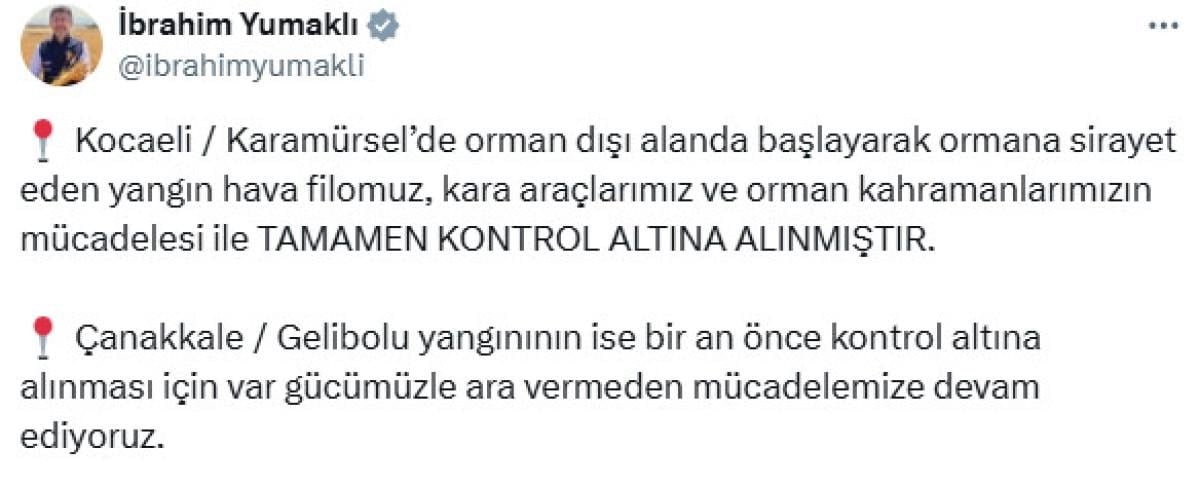 Bakan Yumaklı, Kocaeli'deki yangının bugün tamamen kontrol altına alındığını duyurdu.