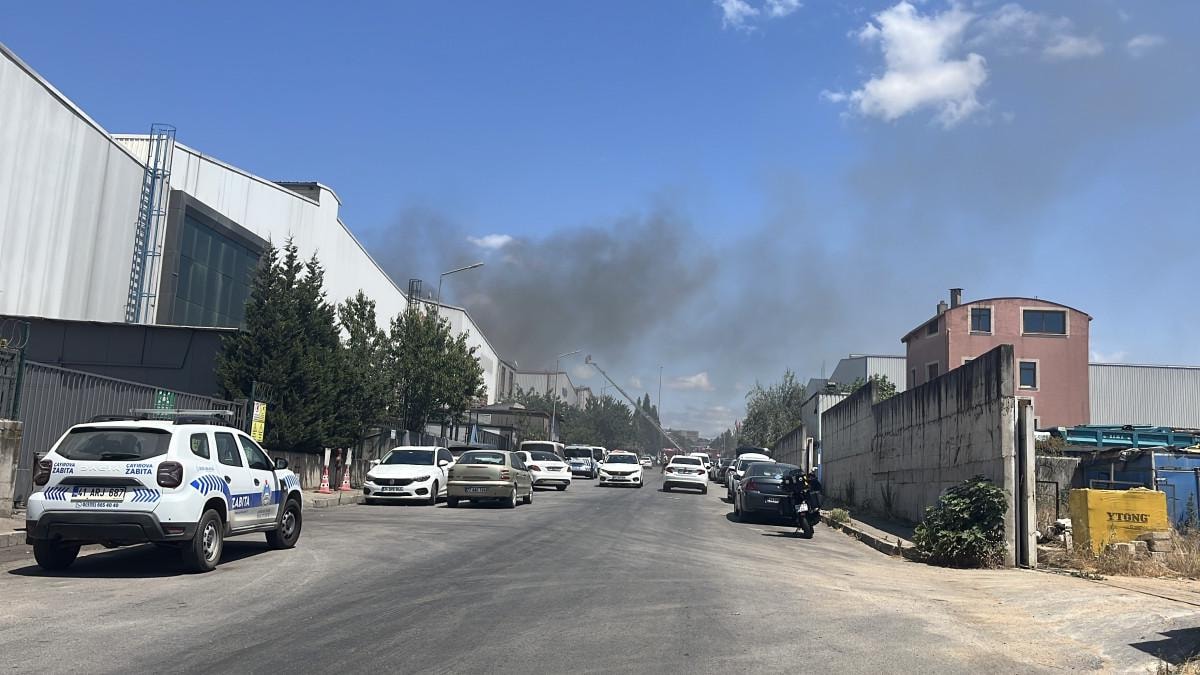 Üretim alanında bulunan plastik malzemelerin tutuşmasıyla başlayan yangın kısa sürede büyüdü.