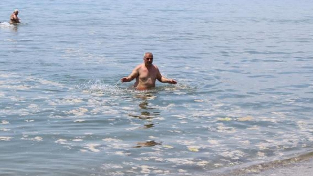Vatandaşlar müsilaj kaplı denizde yüzdü.