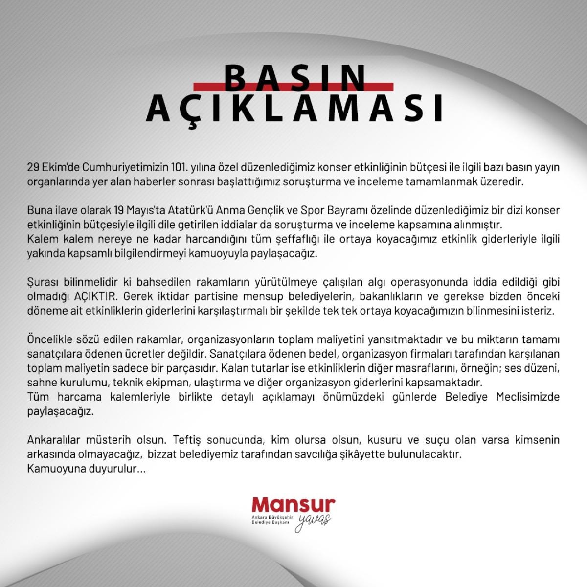 Etkinlik giderleriyle ilgili olarak yakında kapsamlı bilgilendirmeyi kamuoyuyla paylaşacaklarını bildiren Mansur Yavaş, konser bütçeleri üzerine yapılan soruşturma ve incelemenin tamamlanmak üzere olduğunu bildirdi.