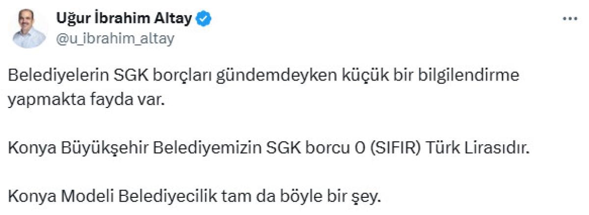 Başkan Altay, Konya Büyükşehir Belediyesi'nin SGK'ya borcu olmadığını belirterek "Konya Modeli Belediyecilik tam da böyle bir şey" dedi.