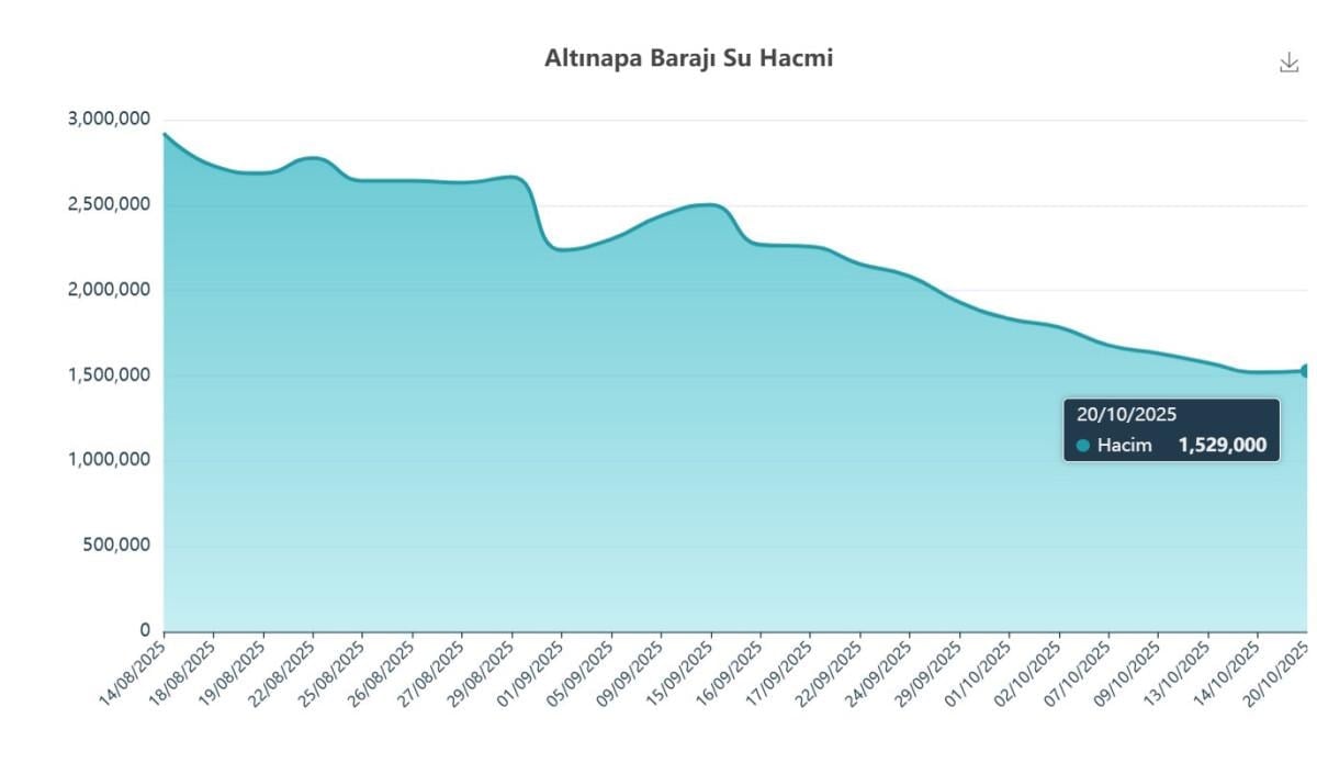 30 milyon metreküp kapasiteli Altınapa Barajı'nda 20 Ekim'de su miktarı 1,5 milyon metreküple yüzde 5 seviyelerinde ölçüldü.
